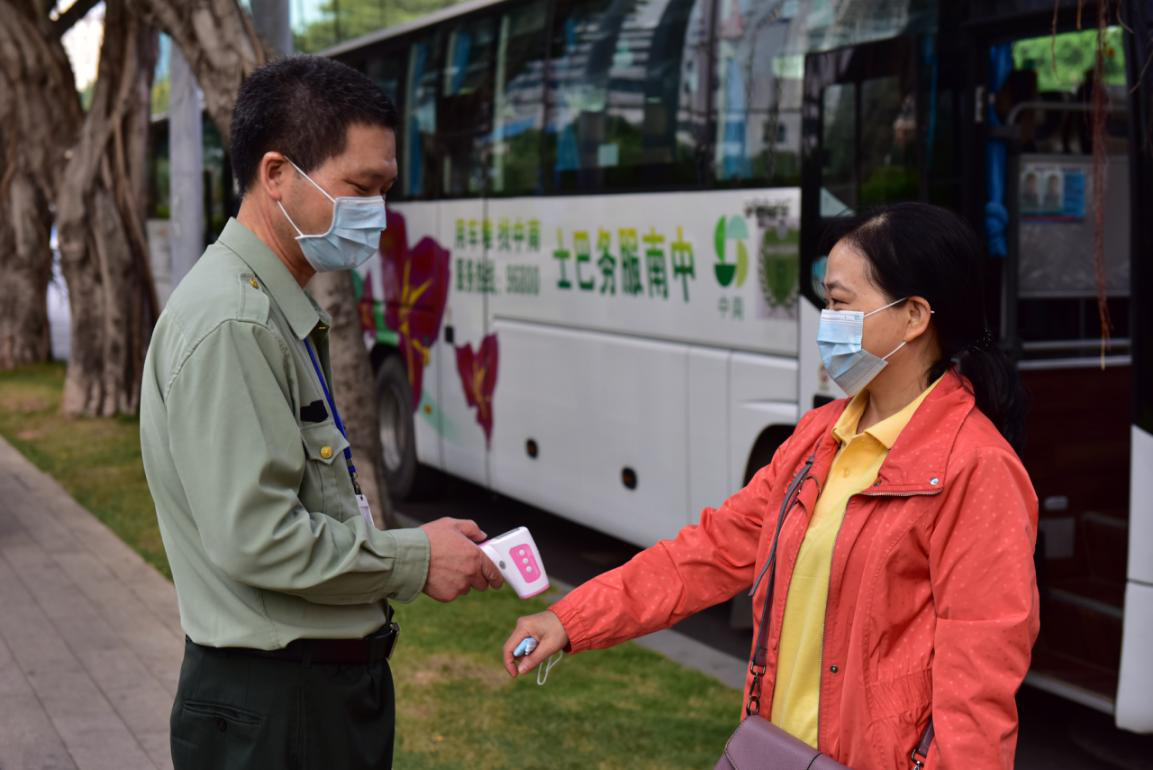 早上8:00,后勤保障部门早早抵达出发现场,对每位参与员工进行测量体温并发放口罩,确保快乐、平安出行。
